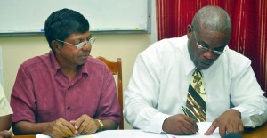 GTU President Colin Bynoe signs the new teachers’ pact as Education Minister Shaik Baksh looks on