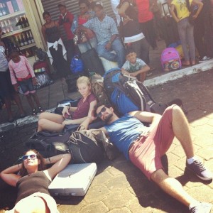 Onlookers amused by the Inca Rally team relaxing on the pavement after completing their adventure