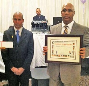 Paul Bacchus of Keybase Financial, one of the patrons of The Caribbean Children Foundation, receiving an Award of Recognition from TCCF President Jay Brijpaul for the company’s corporate sponsorship
