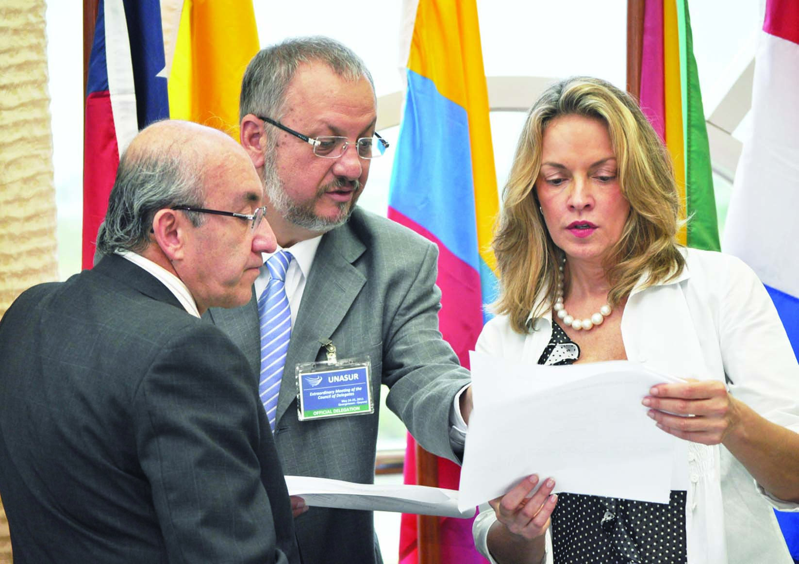 UNASUR Secretary General Maria Emma Mejia Velez discusses details of the budget with two participating delegates
