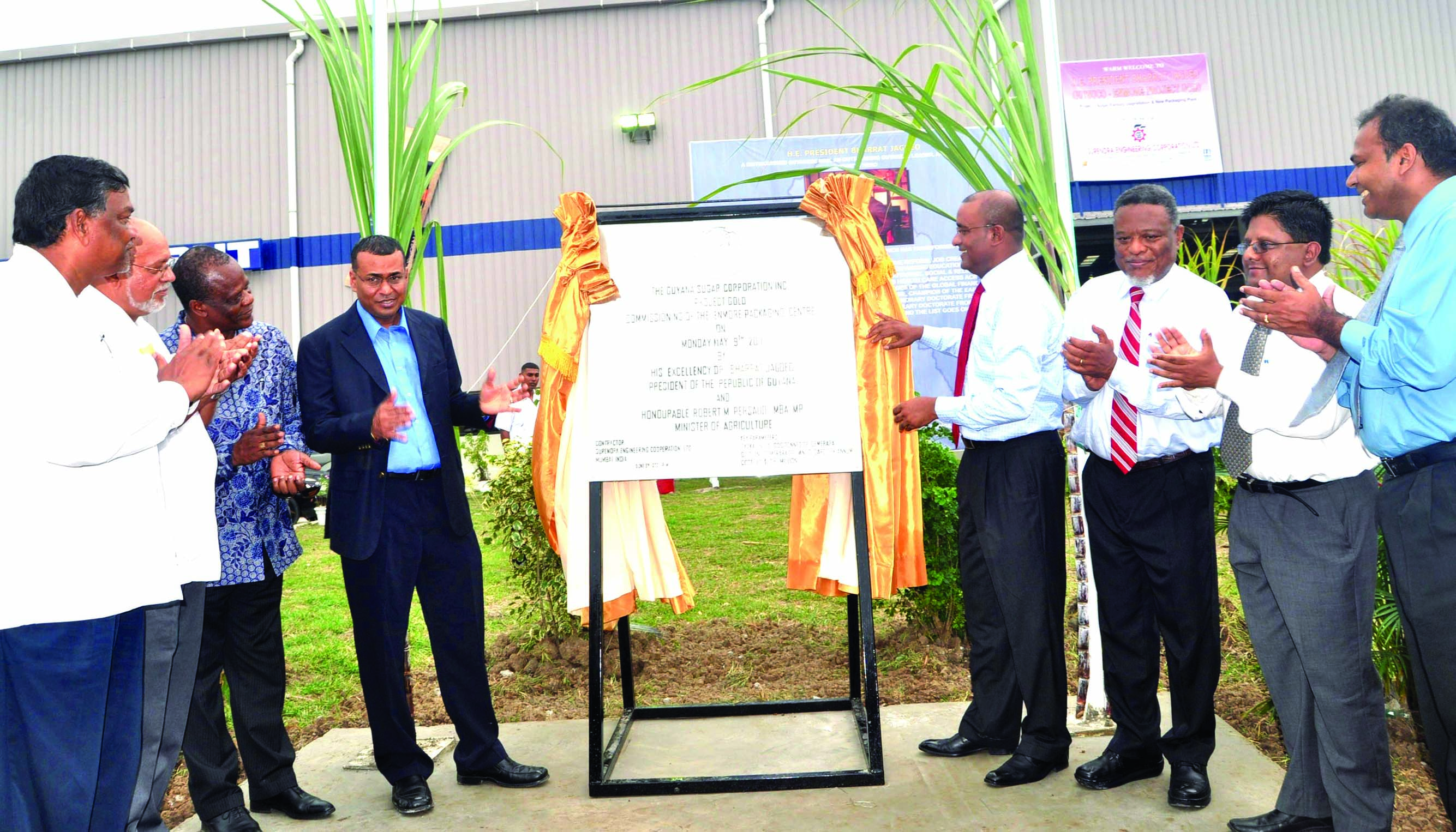 President Bharrat Jagdeo and Agriculture Minister Robert Persaud unveil the plaque of the new packaging plant at Enmore. Applauding are Prime Minister Samuel Hinds, Finance Minister Dr Ashni Singh and Culture Minister Dr Frank Anthony. Also in picture are: Chairman of the GuySuCo board, Dr Nanda Gopaul, and Donald Ramotar, PPP presidential candidate