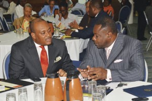 Elbert Ellis of the Caribbean Development Bank (left), in conversation with Steve Blackett, Barbados’ Minister of Social Care, Constituency Empowerment and Community Development.