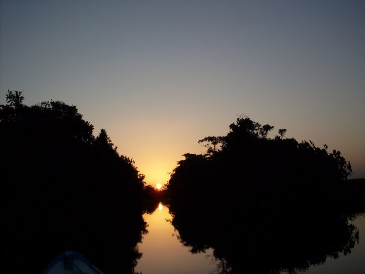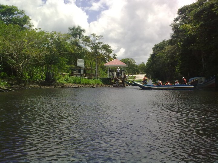 The boat ride into Santa Rosa from Charity is comfortable and well worth the time. Sail up the mouth of the Pomeroon, up the coast, then back inland up the Moruca river through a tunnel of trees with immense roots later opening into savannah with floating reed beds and trees where the boatmen speed over vegetation mats.