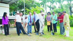 Culture, Youth and Sport Minister Dr Frank Anthony (sixth from left); Indian culturalist and entrepreneur Pradeep Samtaimi (right of the minister) and two officials on Friday in the presence of members of the Indian Commemoration Trust, turn the sod for the renovation of the Indian Monument Gardens