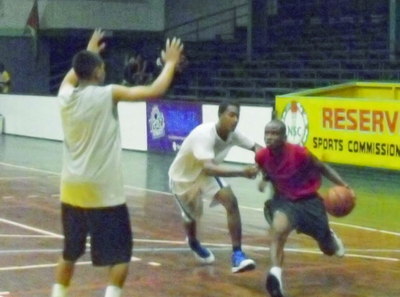 Plaisance’s profilic scorer Nikkoloi Smith (with ball) drives down the lane against two defenders